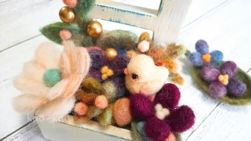 先日完成させたつもりだった 多肉ちゃんアレンジ。 やっぱり納得がいかなくて 小鳥さんの色をチェンジ。 紫のお花やフェルトボールも入れて ついに(今度こそ)完成。 こんな感じになりました。 うん。 やっぱりブルーより クリーム色の小鳥さんの方が しっ…
