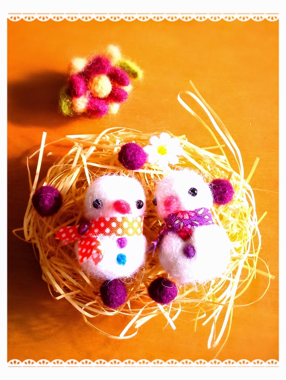 2014-12-06 雪だるま 羊毛フェルト 寒くなりましたね~。 朝、布団からなかなか出られません。(T^T) それでもアレコレやらなくては…と思うと、家族の誰よりも先に起きてしまいます。きっと、どこのお母さんもみんな同じですね。(^o^ゞ 小さな小さな雪だるま達です♪(*^-^*)