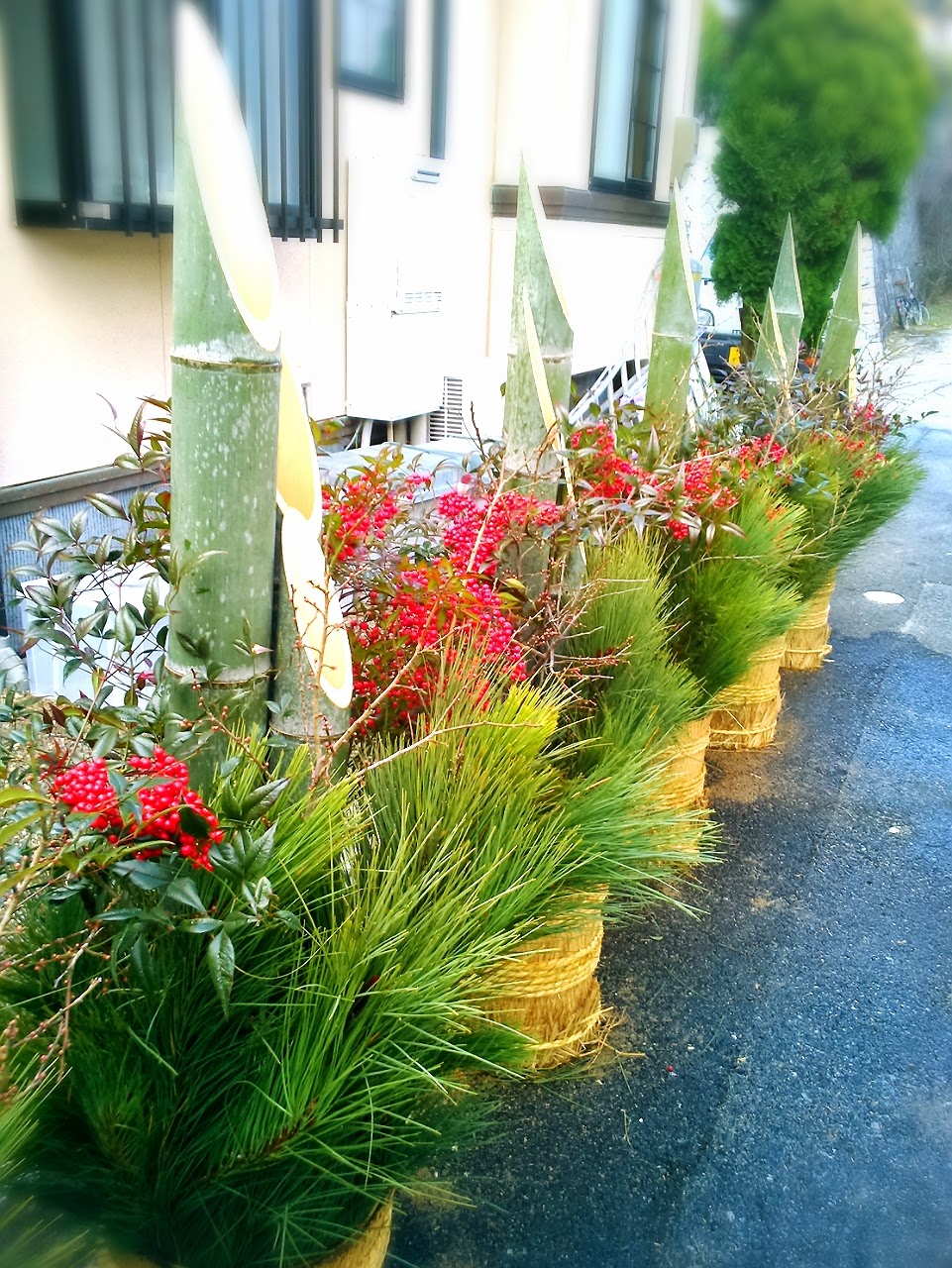 2014-12-23 門松 お花♪ 毎年この時期になると、門松を作る方がご近所にいて、今年も「出来たよ~」と、見せてくださいました。 寒い中、暗くなるまで外で作業されていた日もあり、ずらりと並んだ門松を見ると、何だか私まで嬉しい気持ちになります。(*^▽^*) 素晴らしい仕上がりです! 縁起物なので、竹の長さや縄の数が奇数になるように昔から決まっているそうで、そのこだわりに驚きました。 「材料を集めるのが大変なんだけど、今年も息子が勤めてる会社からお願いされて…」と、ちょっぴり嬉しそうに話してくださいました~。(*^ー^)ノ♪