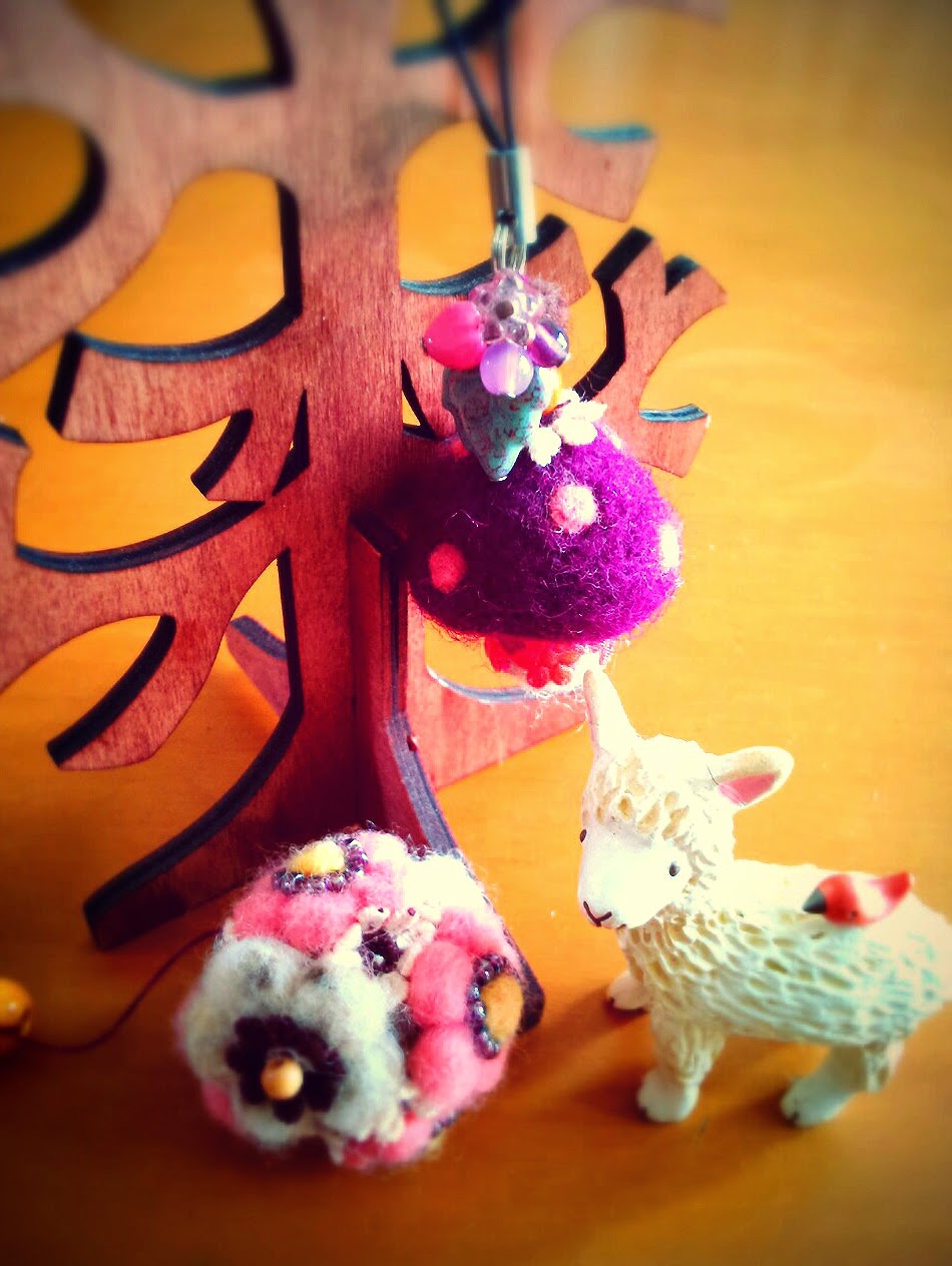 羊毛フェルトで作ったきのこに、葉っぱとお花のビーズをつけました~♪