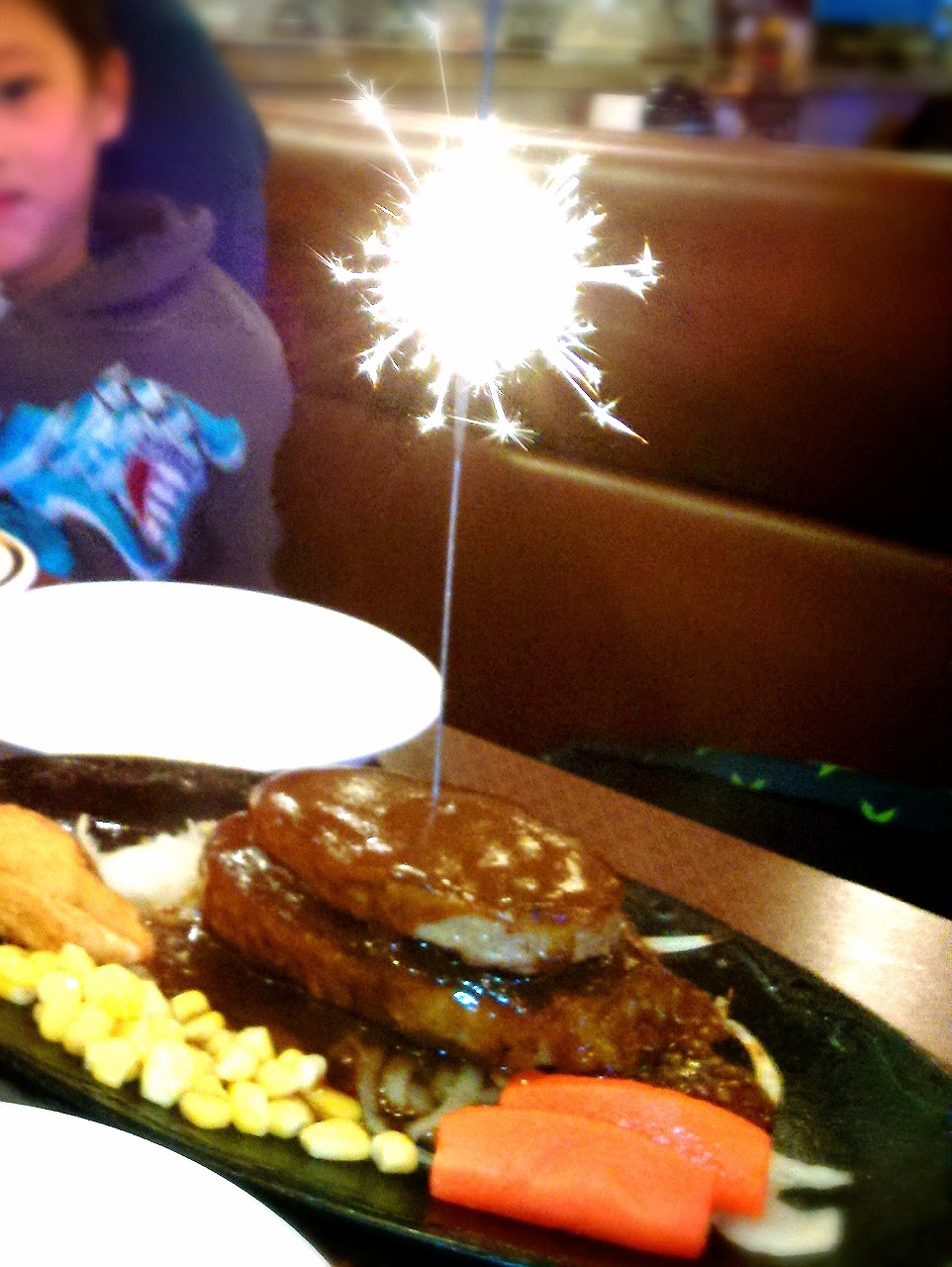 2015-02-15 ハンバーグ! お誕生日♪ 昨日の夜は、ハンバーグを食べに行きました~♪ お誕生日サービスのタワーハンバーグを注文し、上に立てる花火を危ないからと、断ろうとしていた次男くん。 ハッピーバースデーの曲が流れ、ハンバーグが登場しましたが、やっぱり花火を怖がっていました。(笑) 次男くんには多いかなぁ…(^w^) と思っていましたが、ほとんど残さず、ドリンクバーにサラダバー、アイスバイキングを楽しみ、お腹いっぱいになって帰りました~♪