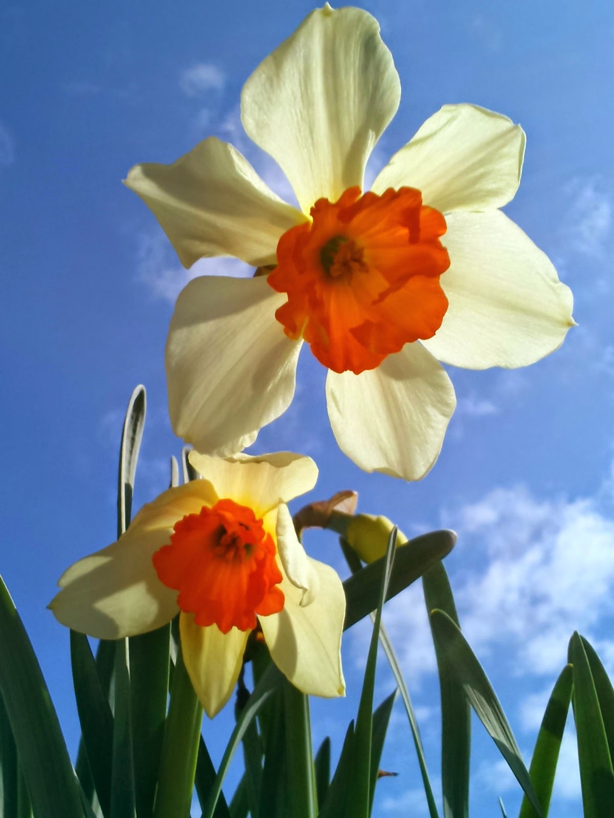 2015-04-09 青空の下で… お花♪ 去年の秋頃、お友達から水仙の球根をいただきました。 寒さに負けず、冬を乗り越えて芽を出し… いつ咲くのかなぁ…? と、ワクワクしていたら… ついに咲きました♪(*´∀`) 球根の中に、こんなに可愛らしい「花のもと」が入っていたなんて、何だか不思議な感じです。 植物のパワーはスゴいですね。 青空をバックに… 綺麗な水仙が撮れました~♪(o^-^o)